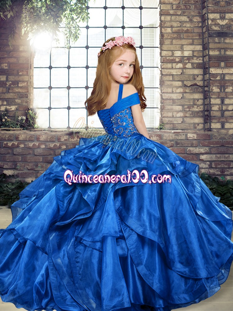 Neckline : StrapsShown Color : BlueSilhouette : Ball GownsSleeve Length : sleevelessHemline : floor lengthBack Detail : Lace upFabric : OrganzaEmbellishment : Beading,RufflesOccasion : Party,Sweet 16,Wedding PartySeason : Spring,Summer,Fall,Winter