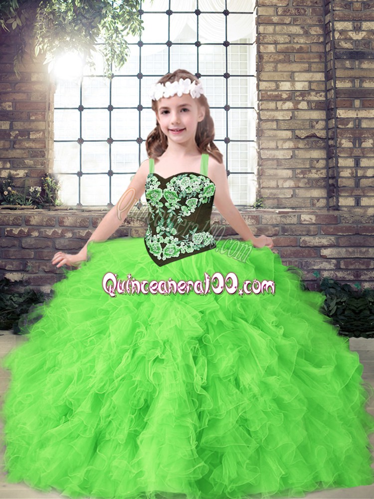 Neckline : StrapsShown Color : Spring GreenSilhouette : Ball GownsSleeve Length : sleevelessHemline : floor lengthBack Detail : Lace upFabric : TulleEmbellishment : Embroidery,RufflesOccasion : Party,Wedding PartySeason : Spring,Summer,Fall,Winter