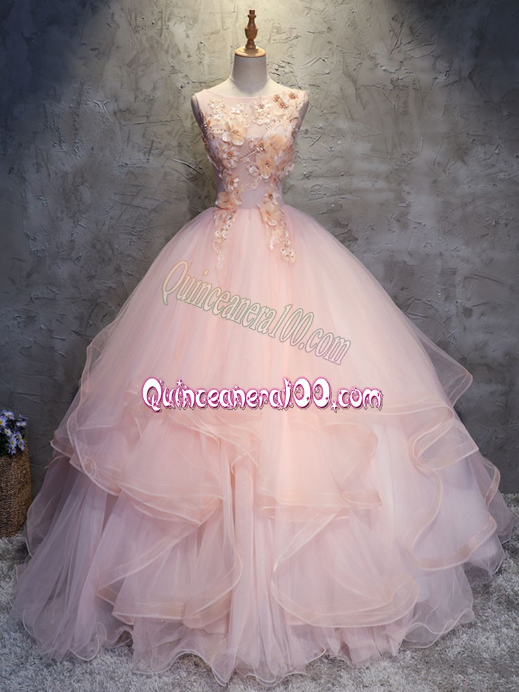 Neckline : ScoopShown Color : Pink Silhouette : Ball GownsSleeve Length : sleevelessHemline : floor lengthBack Detail : Lace upFabric : TulleEmbellishment : Appliques,RufflesOccasion : Military Ball,Sweet 16,QuinceaneraSeason : Spring,Summer,Fall,Winter
