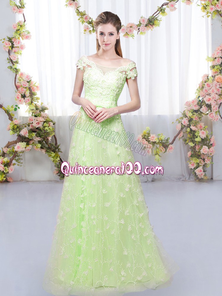 Neckline : Off the shoulder Shown Color : Yellow Green Silhouette : Empire Sleeve Length : cap sleeves Hemline : floor length Back Detail : Lace up Fabric : Tulle Embellishment : Appliques Occasion : Prom,Party,Wedding Party Season : Spring,Summer,Fall,Winter
