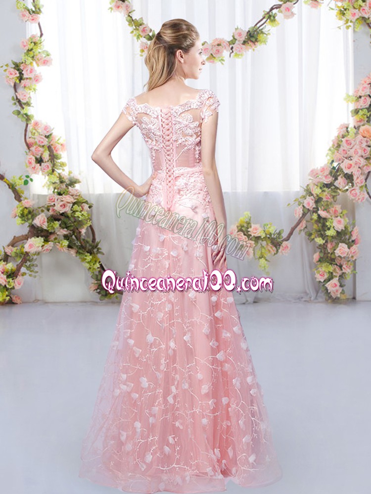 Customized Tulle Cap Sleeves Floor Length Damas Dress and Appliques