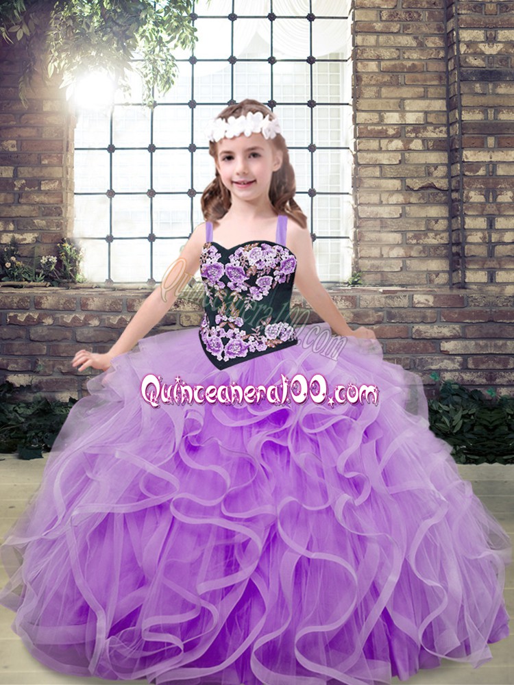 Neckline : StrapsShown Color : LavenderSilhouette : Ball GownsSleeve Length : sleevelessHemline : floor lengthBack Detail : Lace upFabric : TulleEmbellishment : Embroidery,RufflesOccasion : Party,Wedding PartySeason : Spring,Summer,Fall,Winter