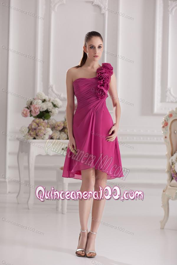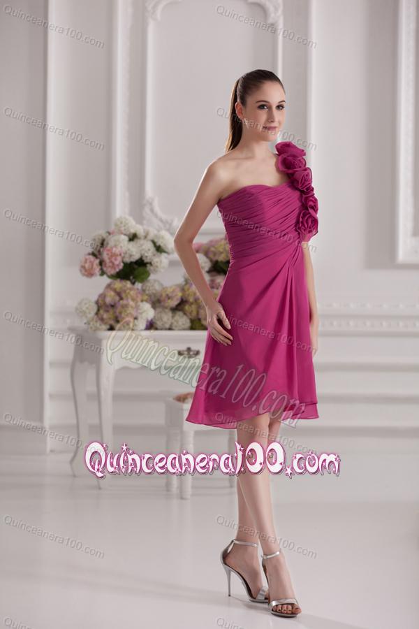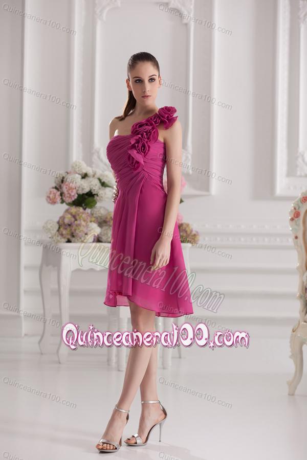 Neckline : One shoulderShown Color : FuchsiaSilhouette : ShortSleeve Length : sleevelessHemline : knee lengthBack Detail : ZipperFabric : ChiffonEmbellishment : Ruching,Hand Made FlowerOccasion : Sweet 16,Quinceanera,Wedding PartySeason : Spring,Summer,Fall