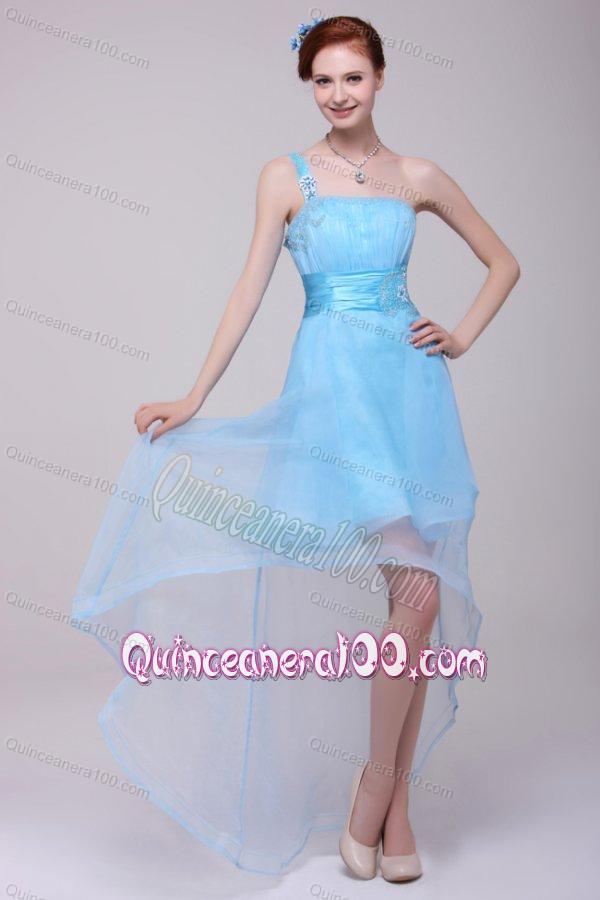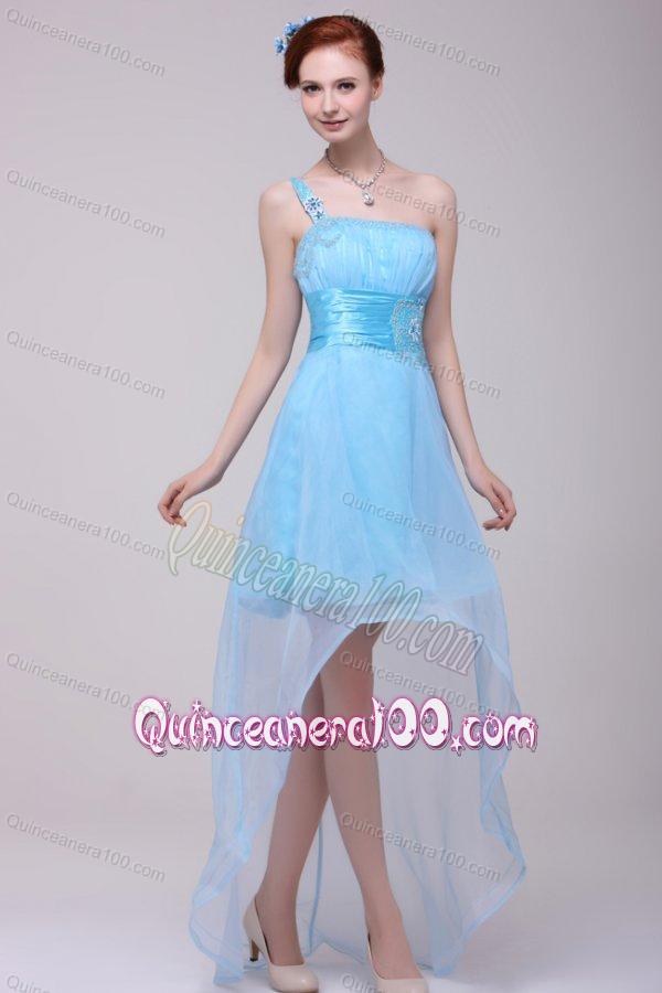 Light Blue One Shoulder High-low Beaded Decorate Dresses for Dama