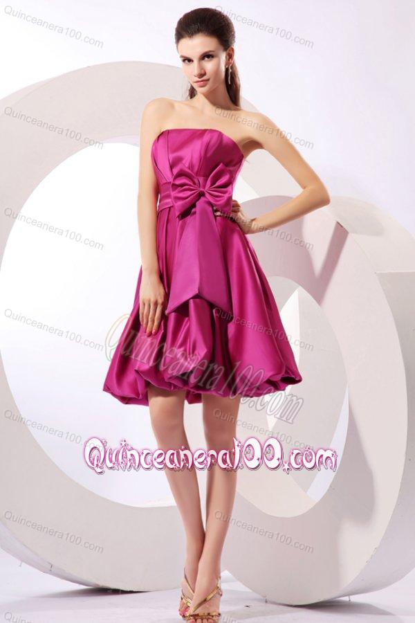 Neckline : StraplessShown Color : FuchsiaSilhouette : ShortSleeve Length : sleevelessHemline : knee lengthBack Detail : ZipperFabric : SatinEmbellishment : BowknotOccasion : Sweet 16,Quinceanera,Wedding PartySeason : Spring,Summer,Fall