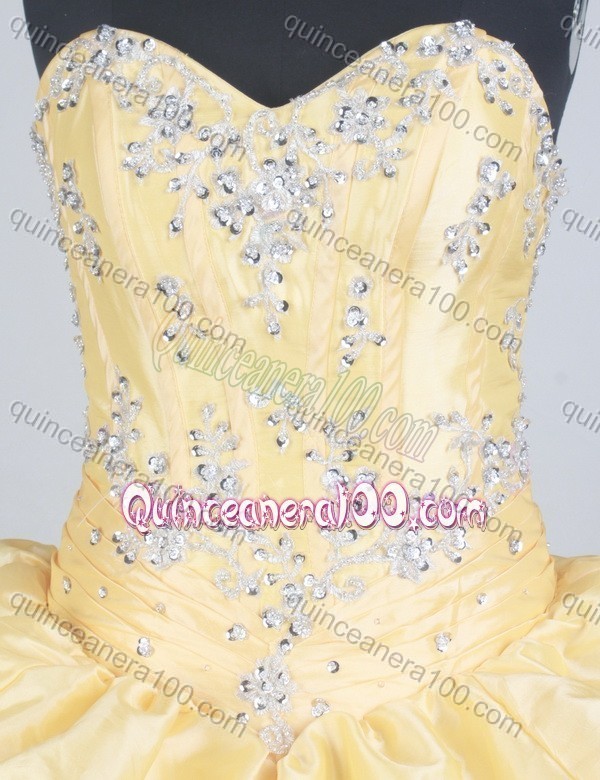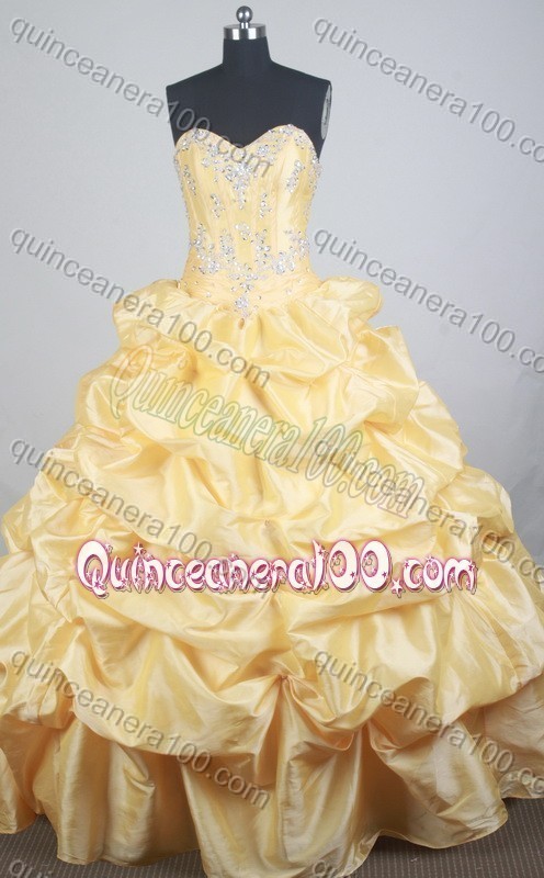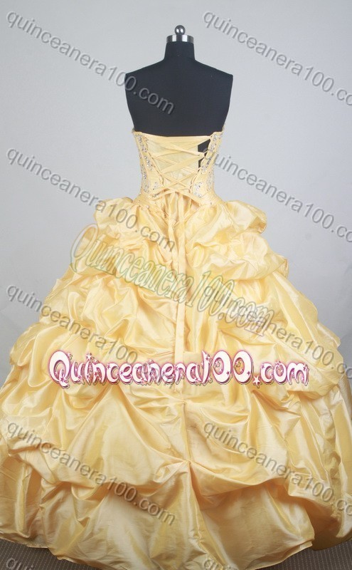 Neckline : SweetheartShown Color : YellowSilhouette : Ball GownsSleeve Length : sleevelessHemline : floor lengthBack Detail : Lace upFabric : TaffetaEmbellishment : Beading,Pick UpsOccasion : Prom,Military Ball,Sweet 16,QuinceaneraSeason : Spring,Summer,Fall,Winter