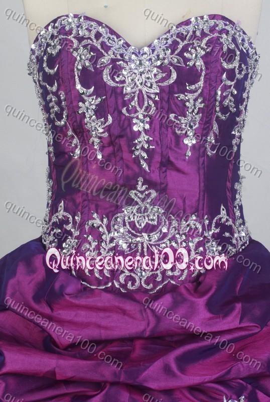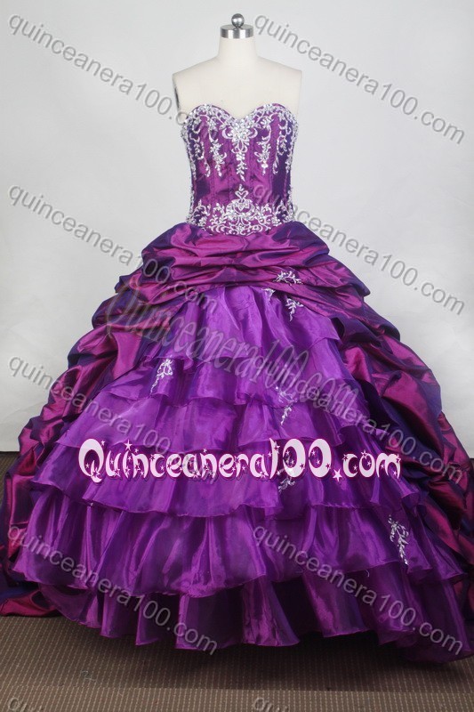 Neckline : SweetheartShown Color : PurpleSilhouette : Ball GownsSleeve Length : sleevelessHemline : floor lengthBack Detail : Lace upFabric : Organza,TaffetaEmbellishment : AppliquesOccasion : Prom,Military Ball,Sweet 16,QuinceaneraSeason : Spring,Summer,Fall,Winter