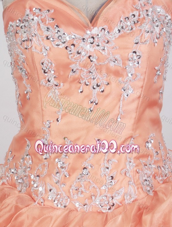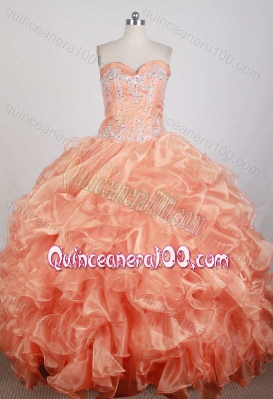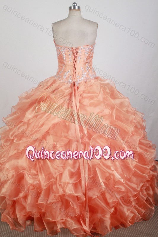 Neckline : SweetheartShown Color : OrangeSilhouette : Ball GownsSleeve Length : sleevelessHemline : floor lengthBack Detail : Lace upFabric : OrganzaEmbellishment : Ruffles,SequinsOccasion : Prom,Military Ball,QuinceaneraSeason : Spring,Summer,Fall,Winter