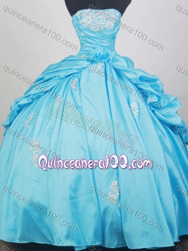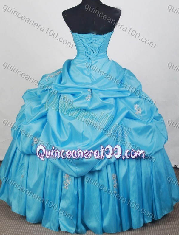 Neckline : StraplessShown Color : Blue,Baby BlueSilhouette : Ball GownsSleeve Length : sleevelessHemline : floor lengthBack Detail : Lace upFabric : TaffetaEmbellishment : AppliquesOccasion : Prom,Military Ball,Sweet 16,QuinceaneraSeason : Spring,Summer,Fall,Winter