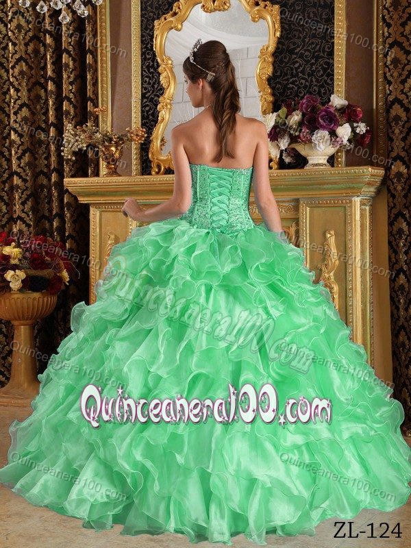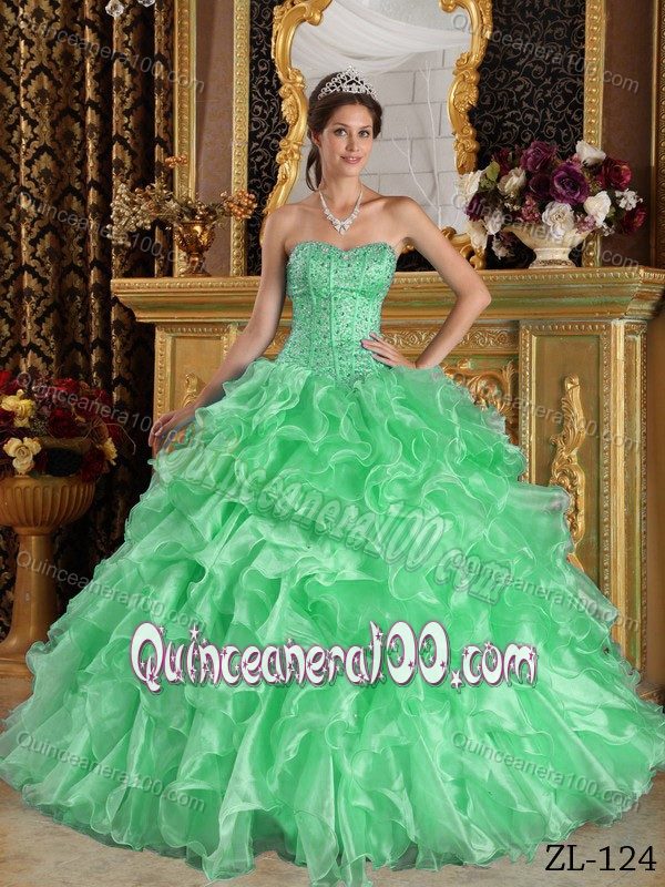 Neckline : SweetheartShown Color : Apple GreenSilhouette : A-lineSleeve Length : sleevelessBack Detail : Lace upFabric : OrganzaEmbellishment : Beading,RufflesOccasion : Sweet 16,QuinceaneraSeason : Spring,Summer,Fall,Winter
