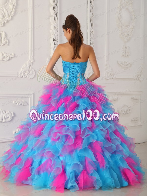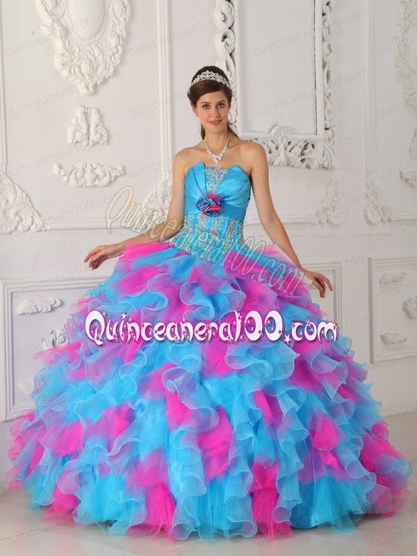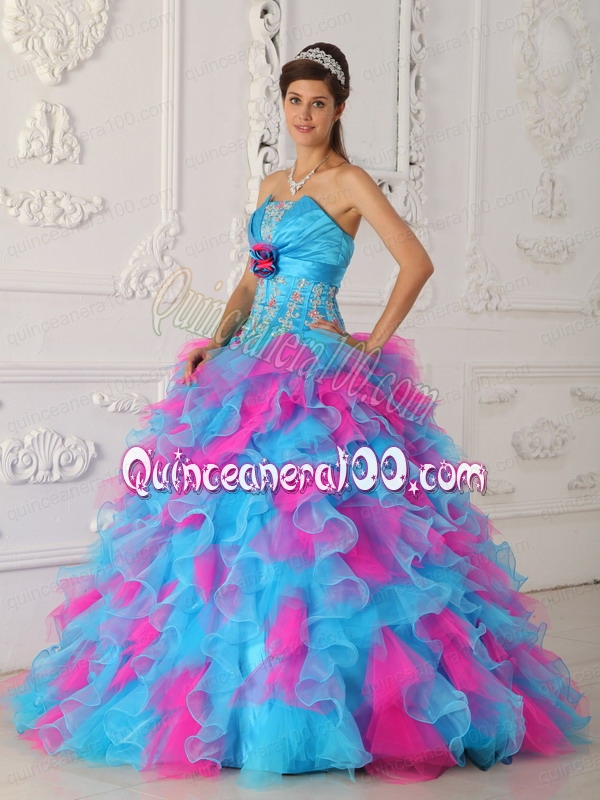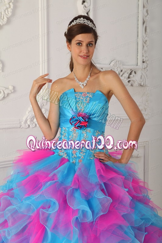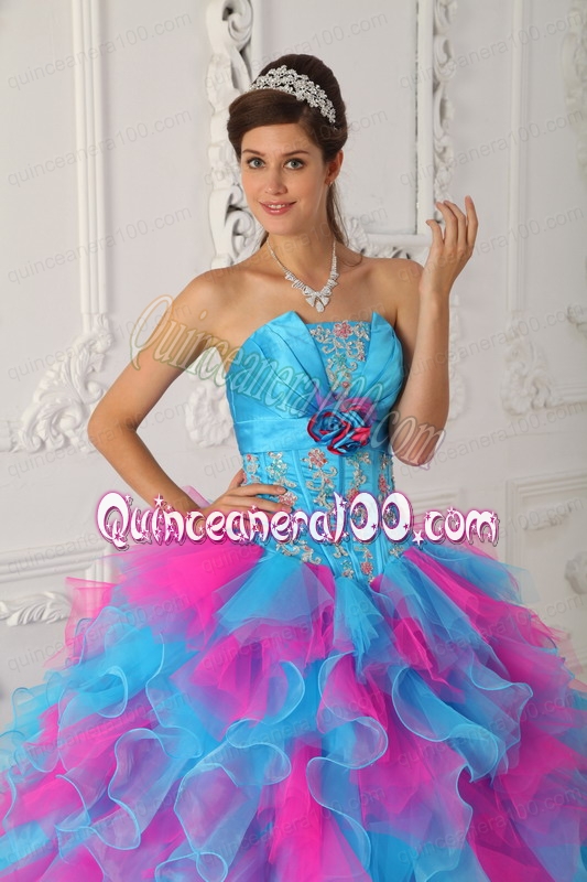 Neckline : StraplessShown Color : Multi-colorSilhouette : Ball GownsSleeve Length : sleevelessHemline : floor lengthBack Detail : Lace upFabric : OrganzaEmbellishment : Appliques,Hand Made FlowerOccasion : Sweet 16,QuinceaneraSeason : Spring,Summer,Fall,Winter