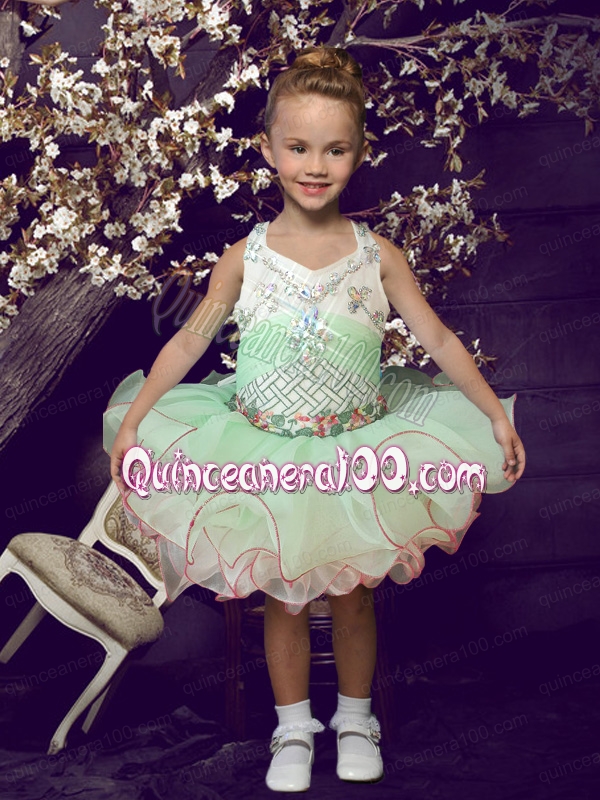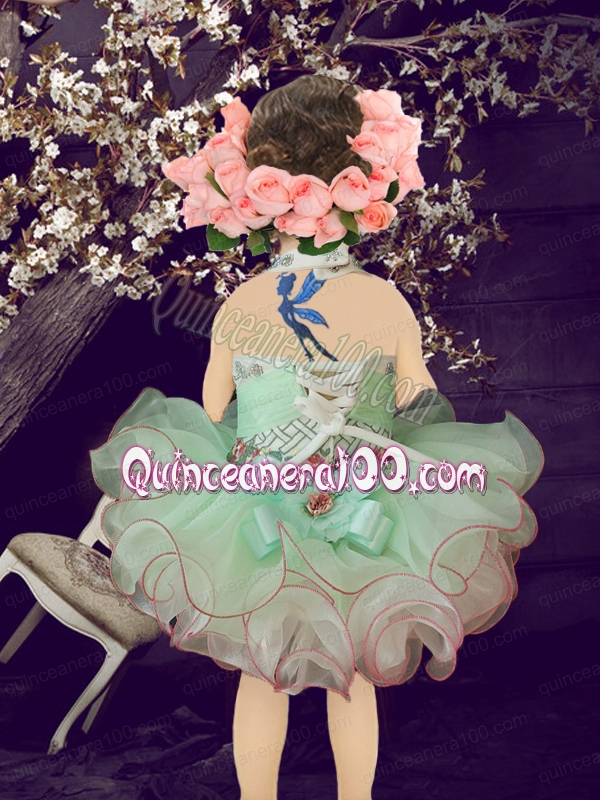 Neckline : Halter top Shown Color : Apple Green Silhouette : Short Sleeve Length : sleeveless Hemline : knee length Back Detail : Lace up Fabric : Organza Embellishment : Beading,Ruffles Occasion : Party,Wedding Party Season : Spring,Summer,Fall