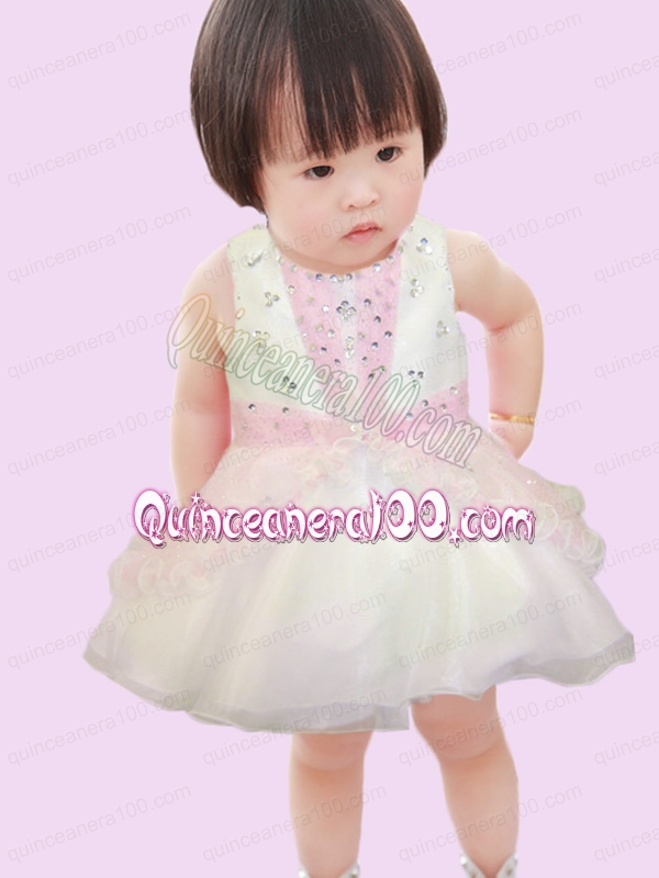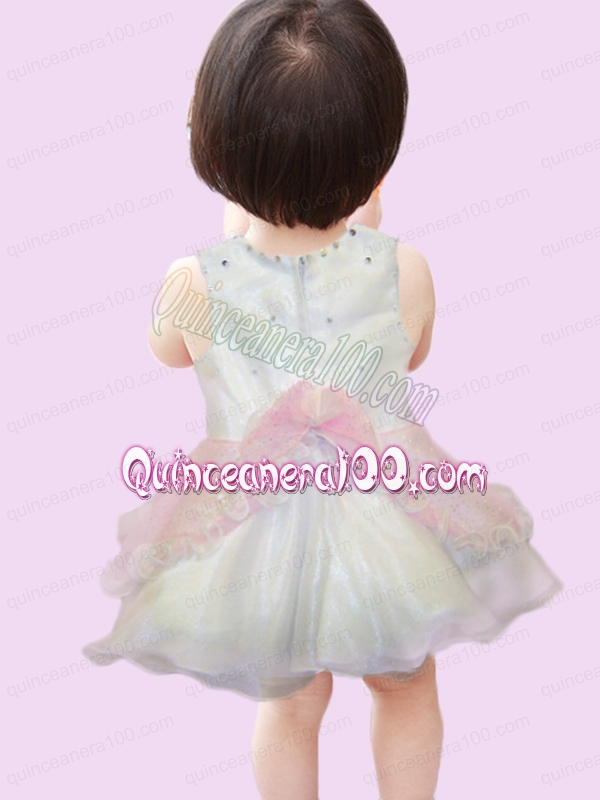 Neckline : ScoopShown Color : WhiteSilhouette : A-lineSleeve Length : sleevelessHemline : mini lengthBack Detail : ZipperFabric : OrganzaEmbellishment : Beading,BowknotOccasion : Party,Wedding PartySeason : Spring,Summer,Fall