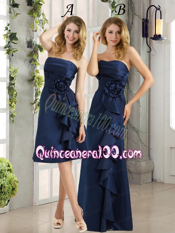 Neckline : StraplessShown Color : Navy BlueSilhouette : EmpireSleeve Length : sleevelessHemline : floor lengthBack Detail : ZipperFabric : TaffetaEmbellishment : Ruching,Hand Made FlowerOccasion : Prom,Sweet 16,Quinceanera,Wedding PartySeason : Spring,Summer,Fall,Winter