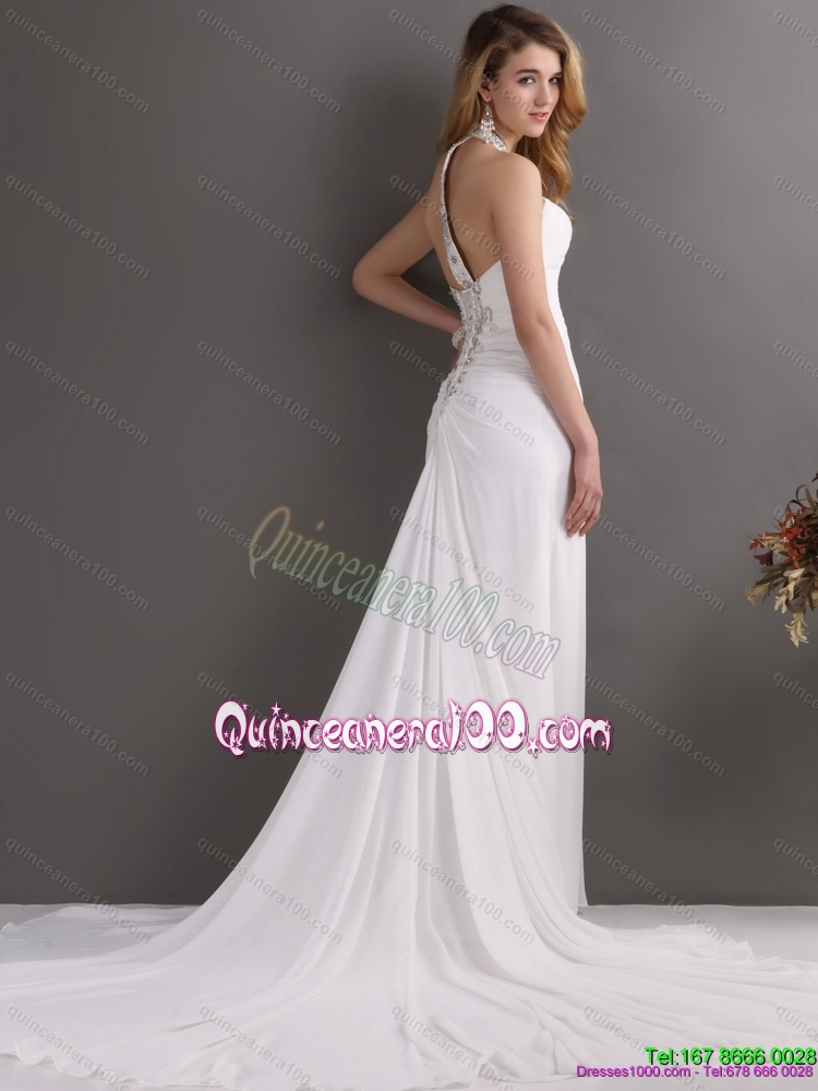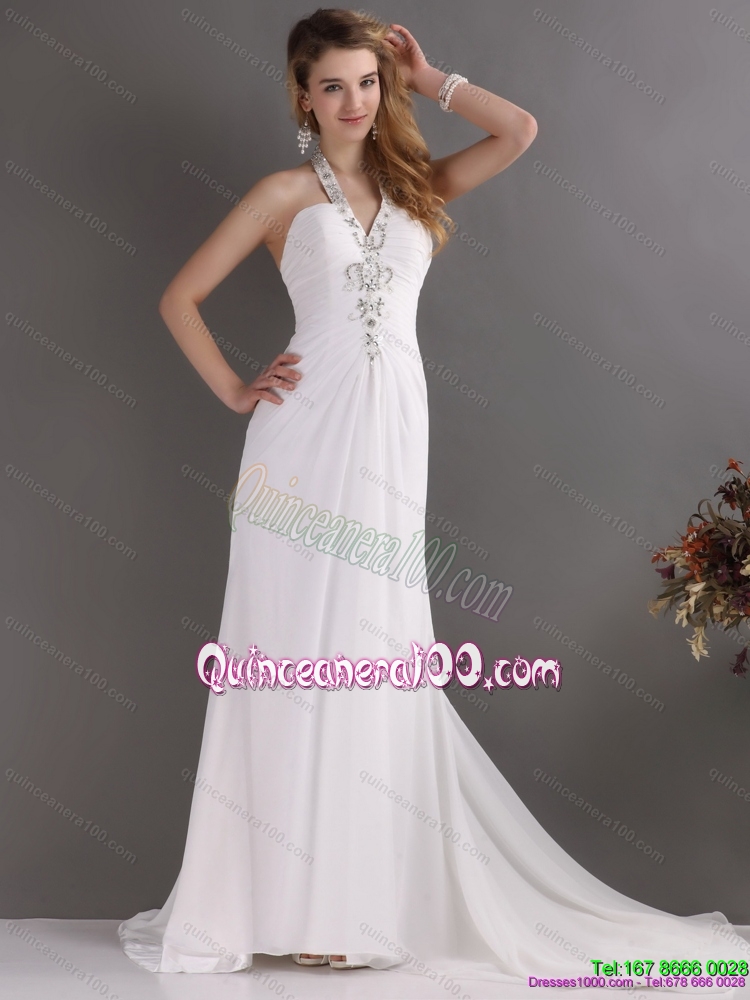 Neckline : Halter topShown Color : WhiteSilhouette : Column/SheathSleeve Length : sleevelessHemline : with trainBack Detail : Lace upFabric : ChiffonEmbellishment : Beading,RuchingOccasion : Prom,PartySeason : Spring,Summer,Fall
