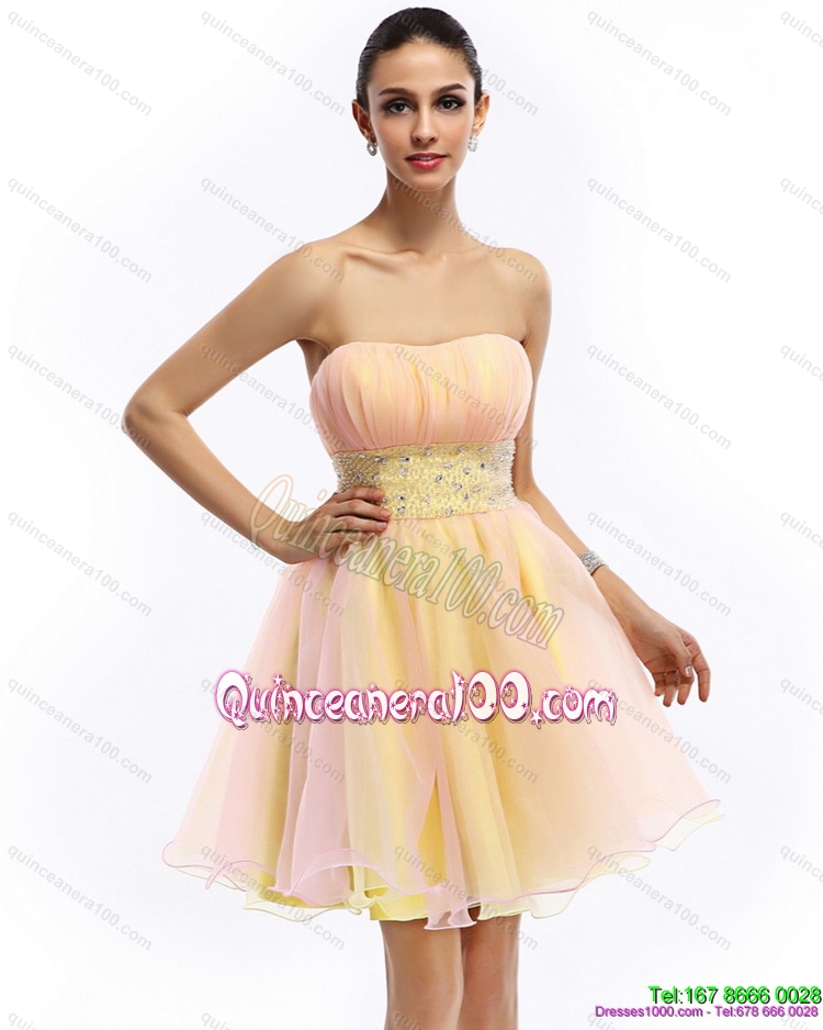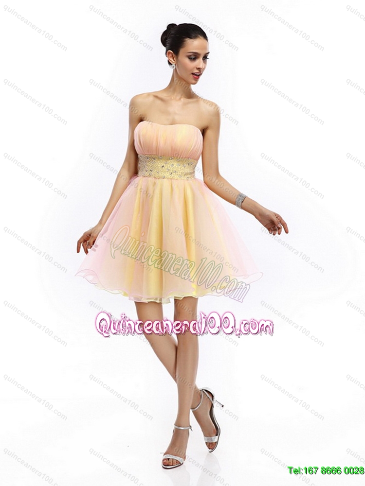 Neckline : StraplessShown Color : Multi-colorSilhouette : A-lineSleeve Length : sleevelessHemline : mini lengthBack Detail : Lace upFabric : OrganzaEmbellishment : Beading,RuchingOccasion : Prom,Party,Beach,Wedding PartySeason : Spring,Summer,Fall