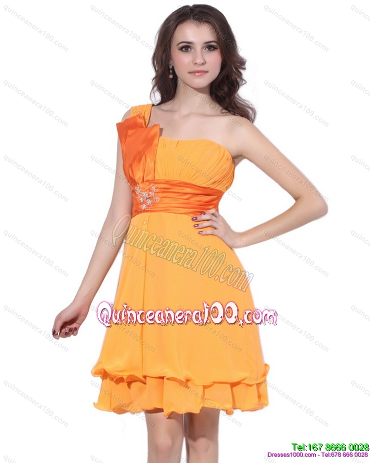 Neckline : One shoulderShown Color : OrangeSilhouette : ShortSleeve Length : sleevelessHemline : mini lengthBack Detail : ZipperFabric : ChiffonEmbellishment : Beading,RuchingOccasion : Prom,PartySeason : Spring,Summer,Fall