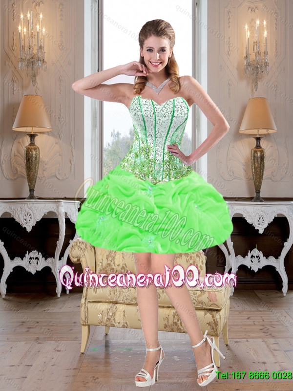 Neckline : SweetheartShown Color : Spring GreenSilhouette : Ball GownsSleeve Length : sleevelessHemline : mini lengthBack Detail : Lace upFabric : TaffetaEmbellishment : Beading,Pick UpsOccasion : Prom,Party,QuinceaneraSeason : Spring,Summer,Fall