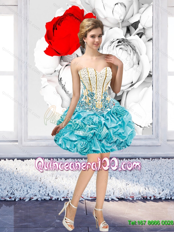 Neckline : SweetheartShown Color : White,Aqua BlueSilhouette : Ball GownsSleeve Length : sleevelessHemline : mini lengthBack Detail : Lace upFabric : TaffetaEmbellishment : Beading,Pick UpsOccasion : Prom,Party,QuinceaneraSeason : Spring,Summer,Fall