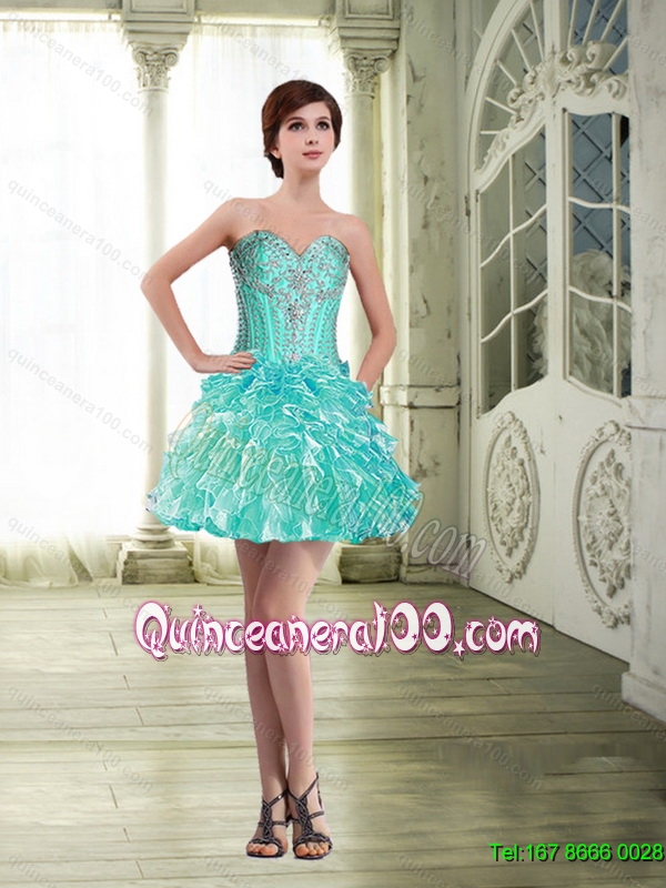 Neckline : SweetheartSilhouette : ShortSleeve Length : sleevelessHemline : mini lengthBack Detail : Lace upFabric : OrganzaEmbellishment : Beading,RufflesOccasion : Prom,Party,QuinceaneraSeason : Spring,Summer,Fall