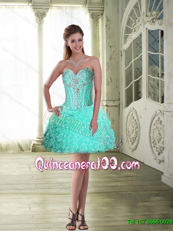 Neckline : Sweetheart Shown Color : Aqua Blue Sleeve Length : sleeveless Hemline : mini length Back Detail : Lace up Fabric : Organza Embellishment : Beading,Ruffles Occasion : Prom,Party,Quinceanera Season : Spring,Summer,Fall