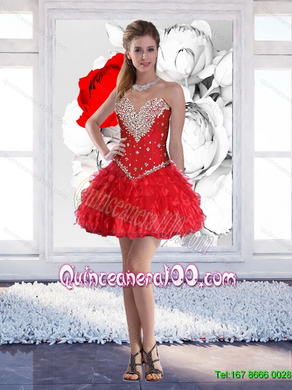 Neckline : SweetheartShown Color : RedSilhouette : Ball GownsSleeve Length : sleevelessHemline : mini lengthBack Detail : Lace upFabric : OrganzaEmbellishment : Beading,RufflesOccasion : Prom,Party,QuinceaneraSeason : Spring,Summer,Fall
