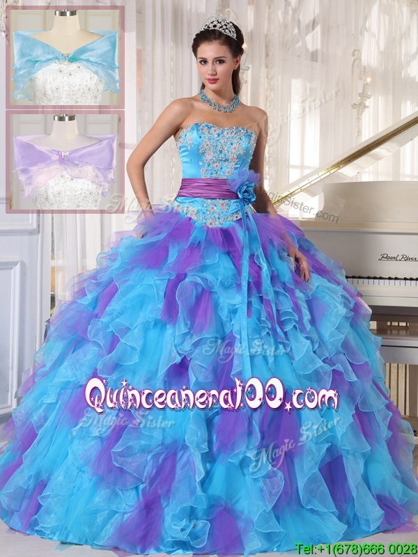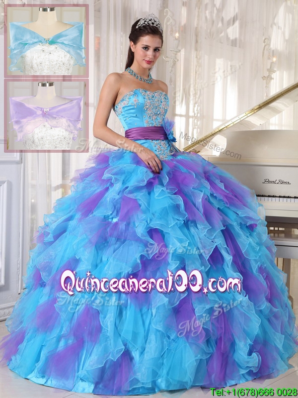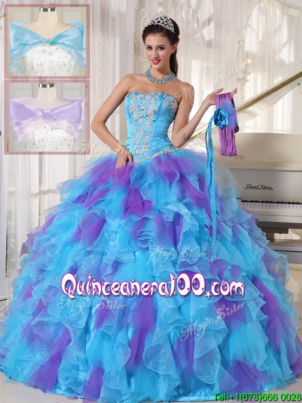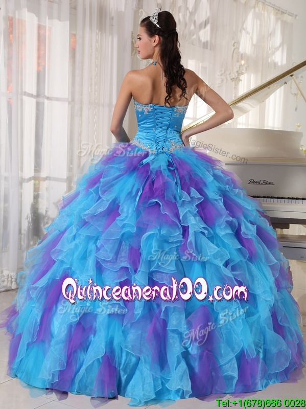 Neckline : StraplessShown Color : Multi-colorSleeve Length : sleevelessHemline : floor lengthBack Detail : Lace upFabric : OrganzaEmbellishment : Beading,AppliquesOccasion : Prom,Sweet 16,QuinceaneraSeason : Spring,Summer,Fall,Winter