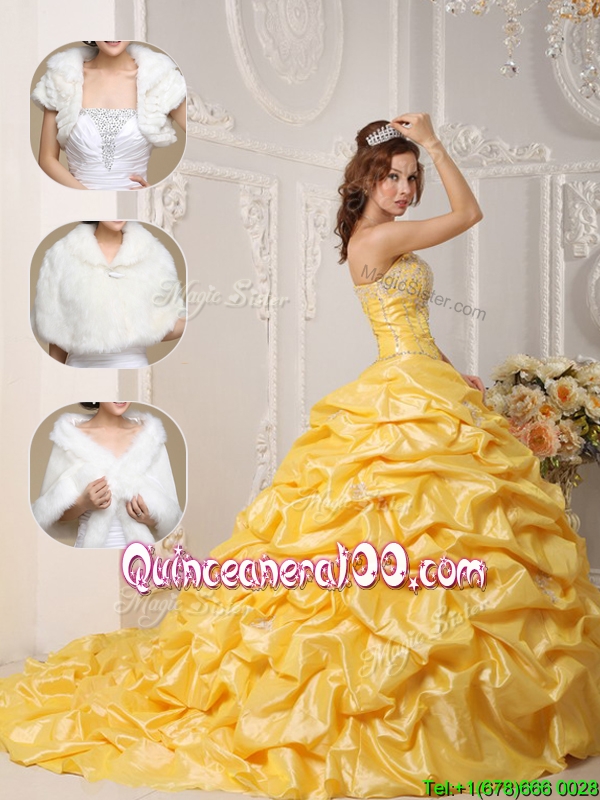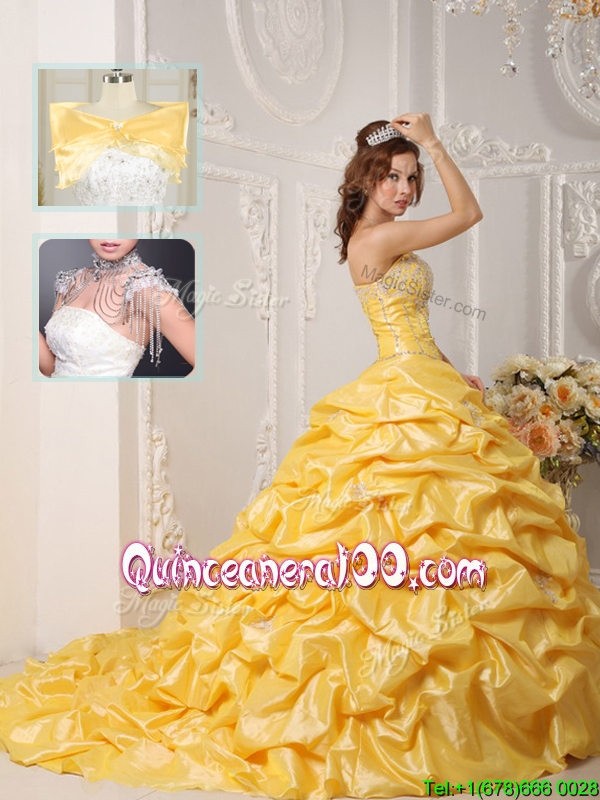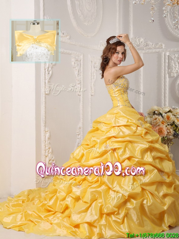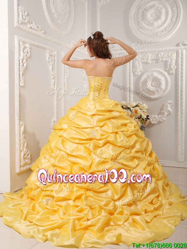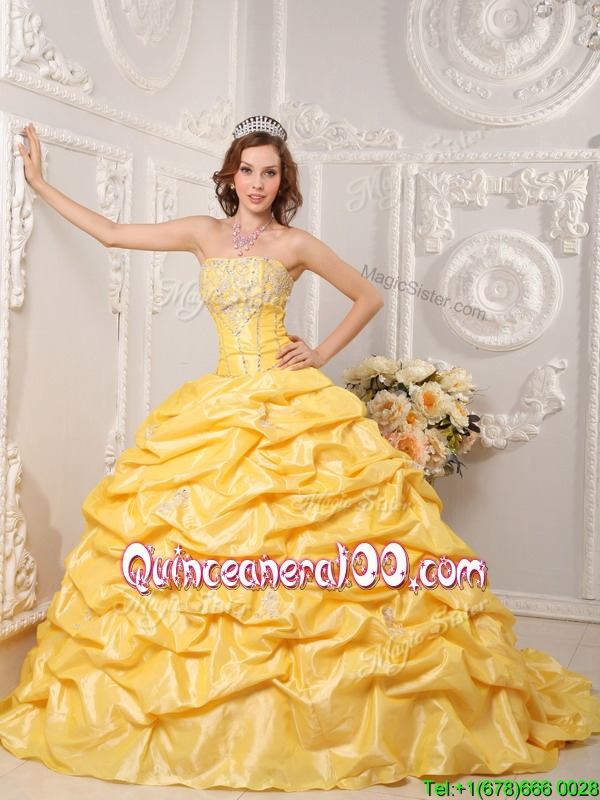 Neckline : StraplessShown Color : YellowSleeve Length : sleevelessHemline : with trainBack Detail : Lace upFabric : TaffetaEmbellishment : Beading,Appliques,Pick UpsOccasion : Prom,Military Ball,Sweet 16,QuinceaneraSeason : Spring,Summer,Fall,Winter
