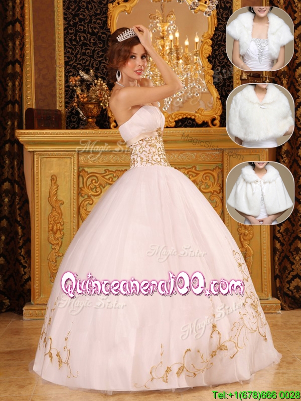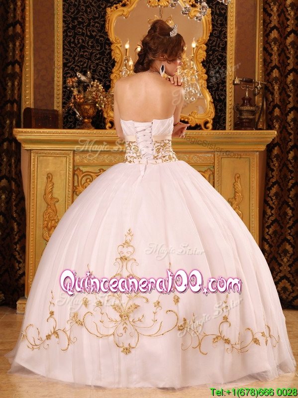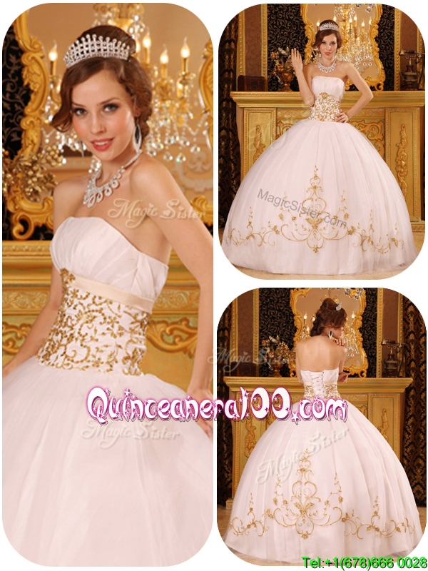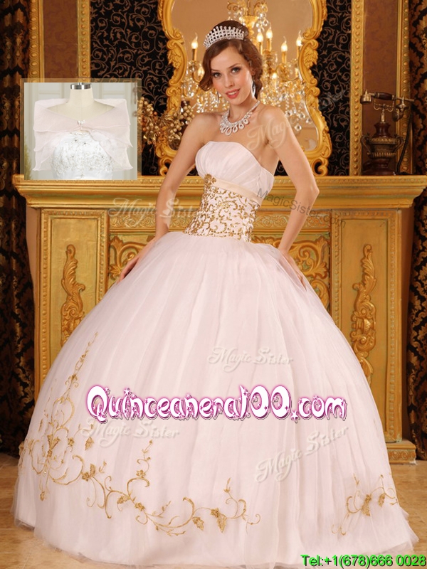 Neckline : StraplessShown Color : WhiteSleeve Length : sleevelessHemline : floor lengthBack Detail : Lace upFabric : Satin,OrganzaEmbellishment : AppliquesOccasion : Prom,Military Ball,QuinceaneraSeason : Spring,Summer,Fall,Winter