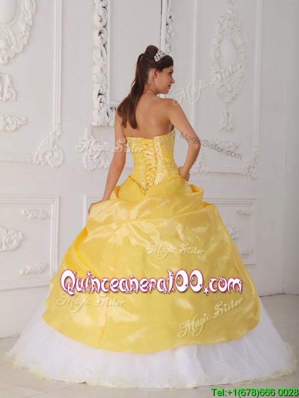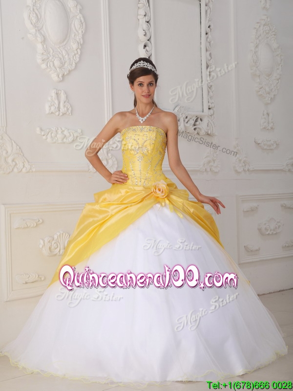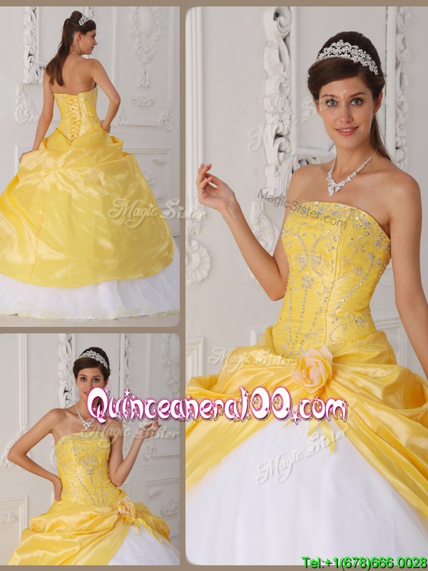 Neckline : StraplessShown Color : White,YellowSilhouette : Ball GownsSleeve Length : sleevelessHemline : floor lengthBack Detail : Lace upFabric : Organza,TaffetaEmbellishment : Appliques,Hand Made FlowerOccasion : Military Ball,QuinceaneraSeason : Spring,Summer,Fall,Winter
