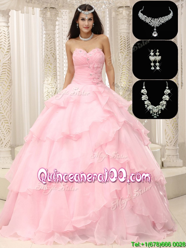 Neckline : SweetheartShown Color : Baby PinkSleeve Length : sleevelessHemline : floor lengthBack Detail : Lace upFabric : OrganzaEmbellishment : Beading,RufflesOccasion : Military Ball,Sweet 16,QuinceaneraSeason : Spring,Summer,Fall,Winter