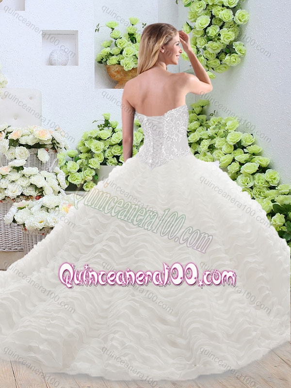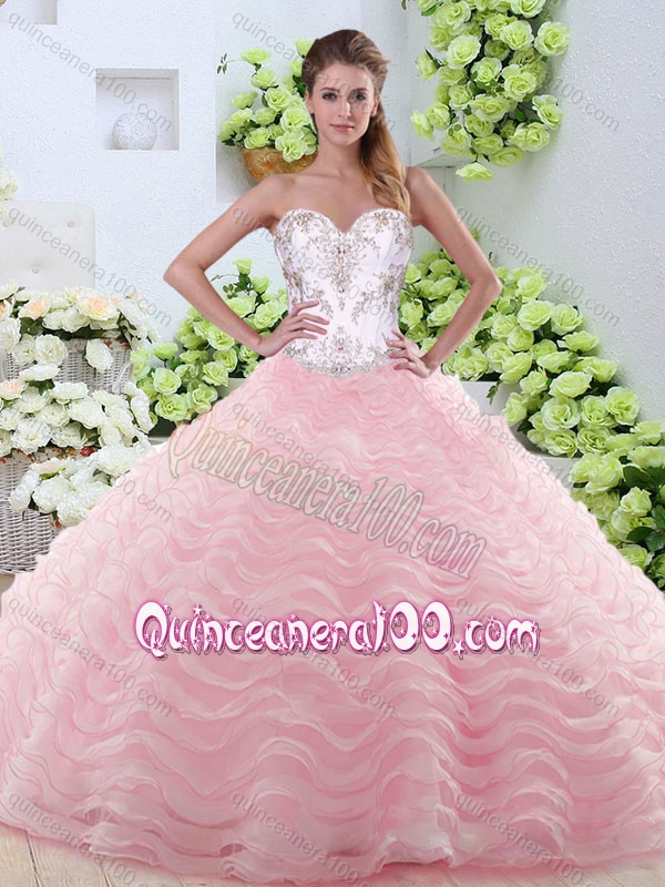 Neckline : SweetheartShown Color : Baby PinkSleeve Length : sleevelessHemline : with trainBack Detail : Lace upFabric : OrganzaEmbellishment : Beading,Ruffled LayersOccasion : Military Ball,Sweet 16,QuinceaneraSeason : Spring,Summer,Fall,Winter