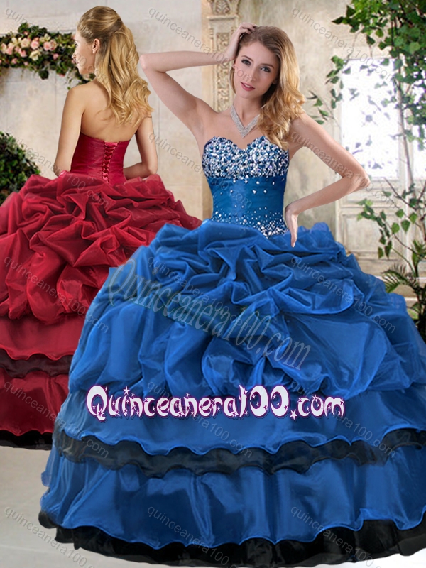 Neckline : SweetheartShown Color : BlueSleeve Length : sleevelessHemline : floor lengthBack Detail : Lace upFabric : Organza,TaffetaEmbellishment : Beading,Pick UpsOccasion : Military Ball,Sweet 16,QuinceaneraSeason : Spring,Summer,Fall,Winter