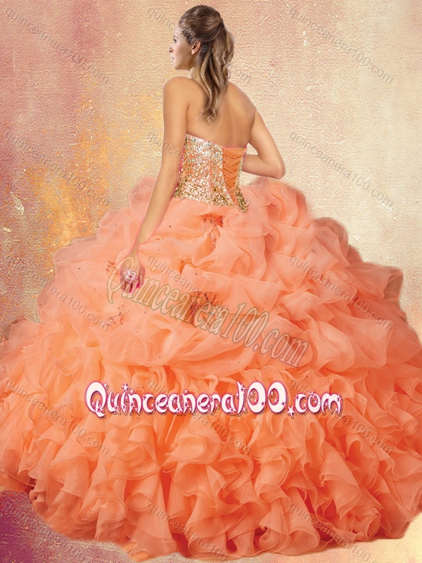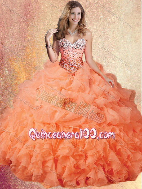 Neckline : SweetheartShown Color : OrangeSleeve Length : sleevelessHemline : with trainBack Detail : Lace upFabric : OrganzaEmbellishment : Beading,Ruffles,Pick UpsOccasion : Military Ball,Sweet 16,QuinceaneraSeason : Spring,Summer,Fall,Winter