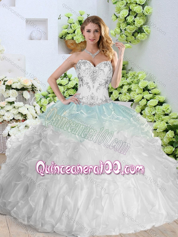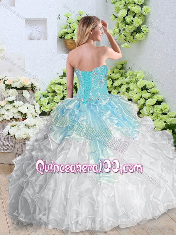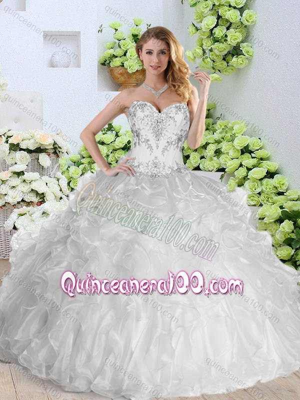 Neckline : SweetheartShown Color : WhiteSleeve Length : sleevelessHemline : floor lengthBack Detail : Lace upFabric : OrganzaEmbellishment : Beading,RufflesOccasion : Military Ball,Sweet 16,QuinceaneraSeason : Spring,Summer,Fall,Winter