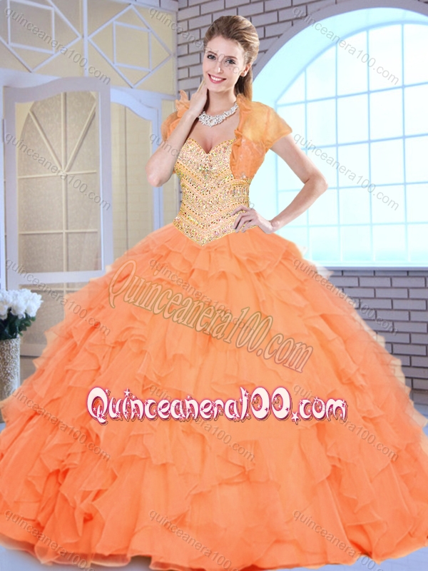 Neckline : SweetheartShown Color : OrangeSleeve Length : sleevelessHemline : floor lengthBack Detail : Lace upFabric : OrganzaEmbellishment : Beading,RufflesOccasion : Military Ball,Sweet 16,QuinceaneraSeason : Spring,Summer,Fall,Winter