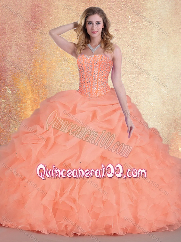 Neckline : SweetheartShown Color : PeachSleeve Length : sleevelessHemline : floor lengthBack Detail : Lace upFabric : OrganzaEmbellishment : Beading,Ruffles,Pick UpsOccasion : Military Ball,Sweet 16,QuinceaneraSeason : Spring,Summer,Fall,Winter