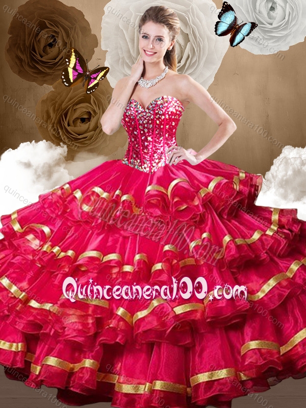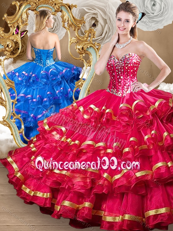 Neckline : SweetheartShown Color : RedSleeve Length : sleevelessHemline : floor lengthBack Detail : Lace upFabric : OrganzaEmbellishment : Beading,Ruffled LayersOccasion : Military Ball,Sweet 16,QuinceaneraSeason : Spring,Summer,Fall,Winter