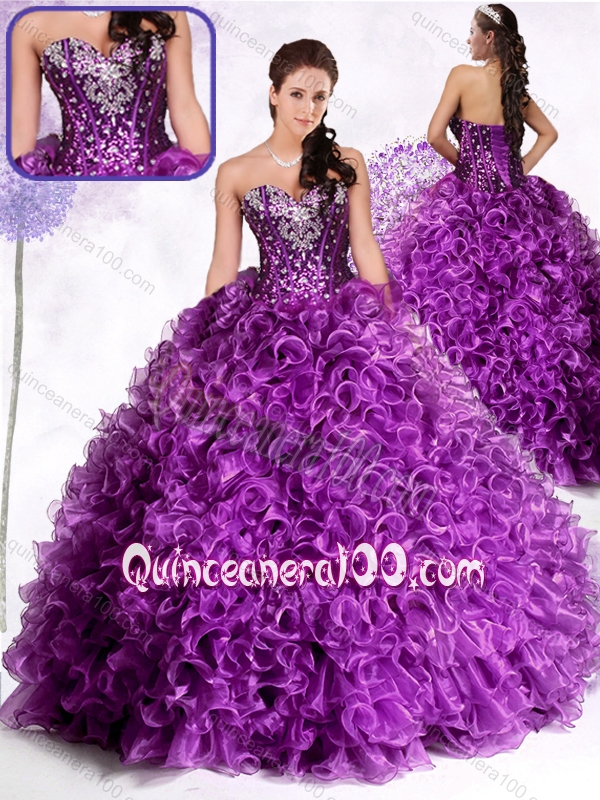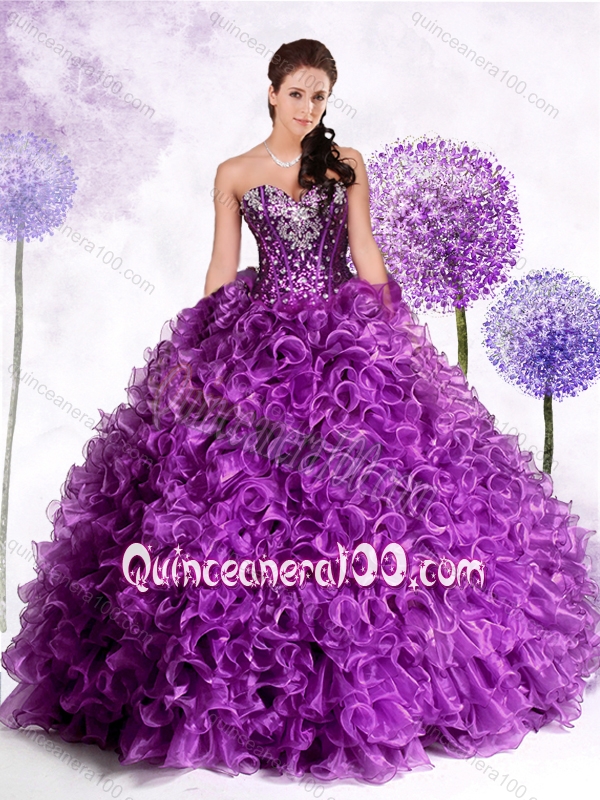 Neckline : SweetheartShown Color : PurpleSilhouette : Ball GownsSleeve Length : sleevelessHemline : floor lengthBack Detail : Lace upFabric : OrganzaEmbellishment : Beading,Ruffles,SequinsOccasion : Military Ball,Sweet 16,QuinceaneraSeason : Spring,Summer,Fall,Winter