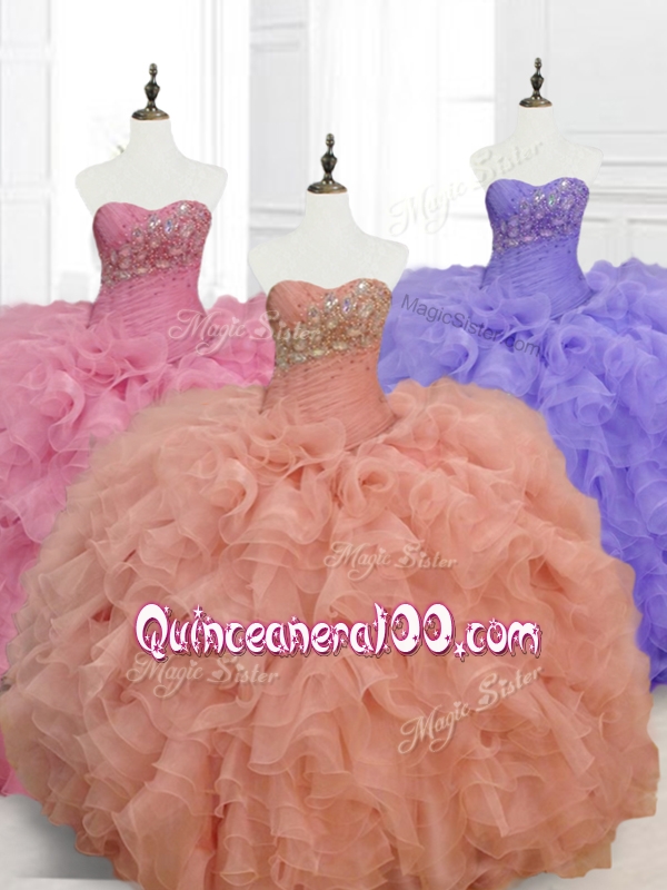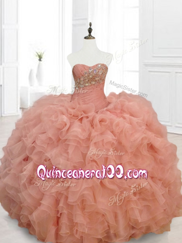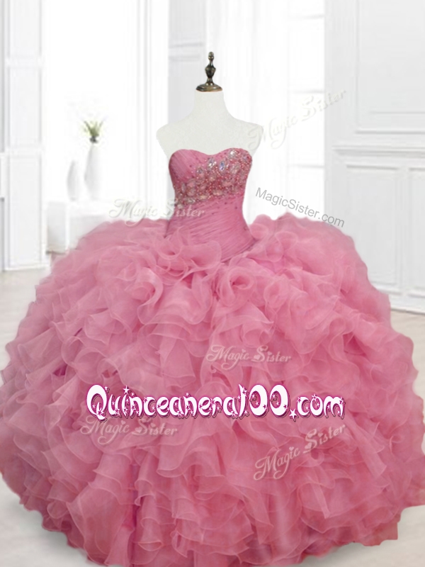 Neckline : SweetheartShown Color : Rose PinkSilhouette : Ball GownsSleeve Length : sleevelessHemline : floor lengthBack Detail : Lace upFabric : OrganzaEmbellishment : Beading,RufflesOccasion : Military Ball,Sweet 16,QuinceaneraSeason : Spring,Summer,Fall,Winter