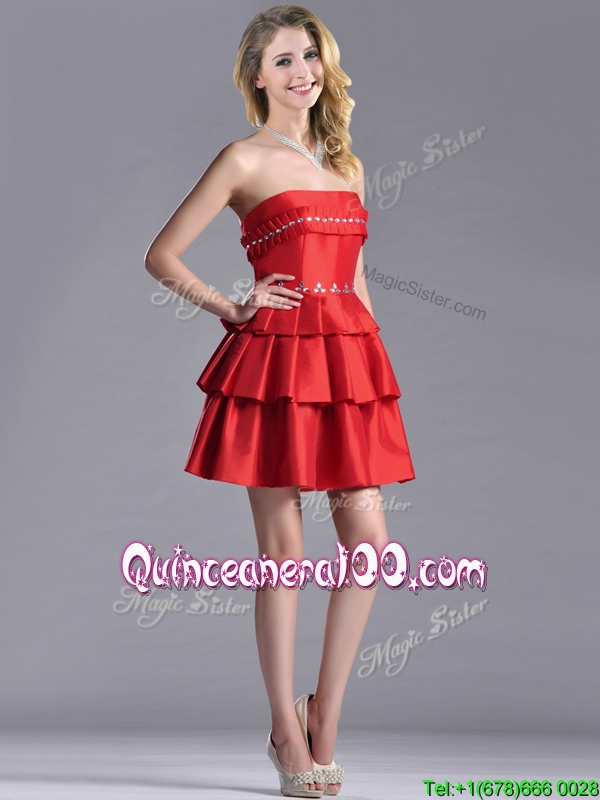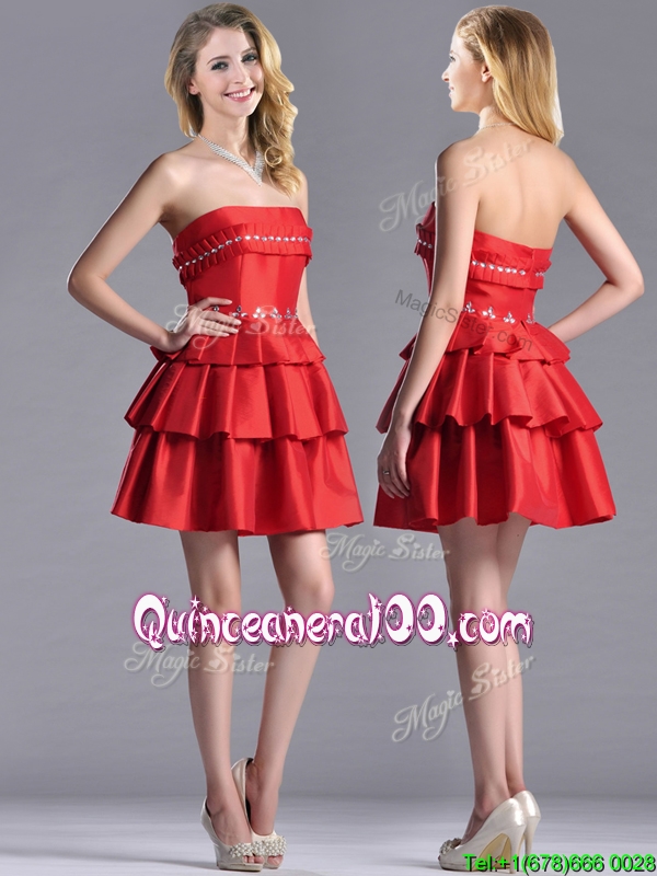Neckline : StraplessShown Color : RedSilhouette : A-lineSleeve Length : sleevelessHemline : mini lengthBack Detail : ZipperEmbellishment : Beading,Ruffled LayersOccasion : Prom,PartySeason : Spring,Summer,Fall