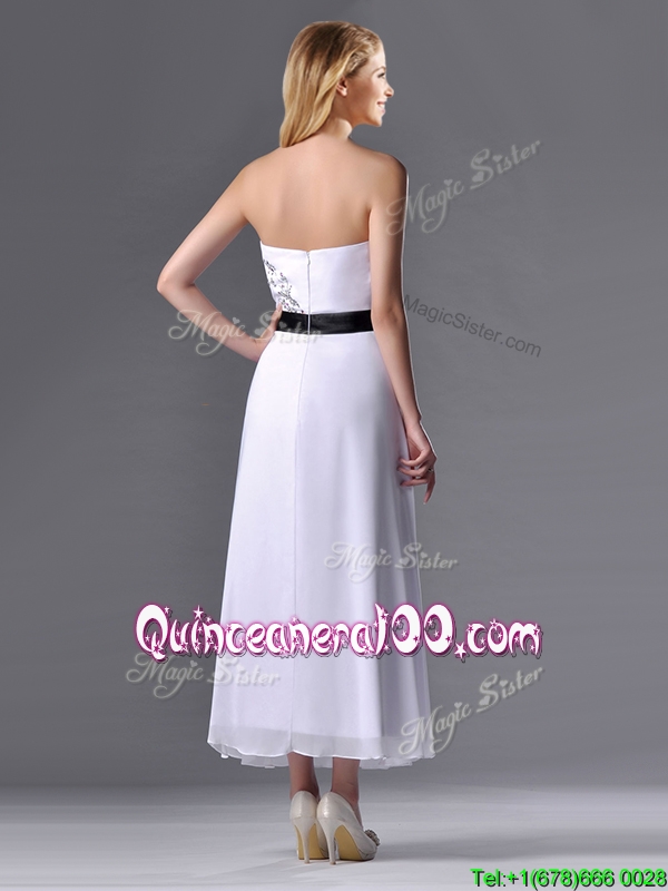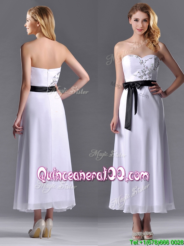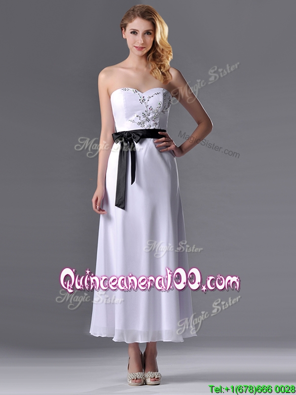 Neckline : SweetheartShown Color : WhiteSilhouette : EmpireSleeve Length : sleevelessHemline : tea lengthBack Detail : ZipperFabric : ChiffonEmbellishment : Appliques,BeltOccasion : PromSeason : Spring,Summer,Fall,Winter