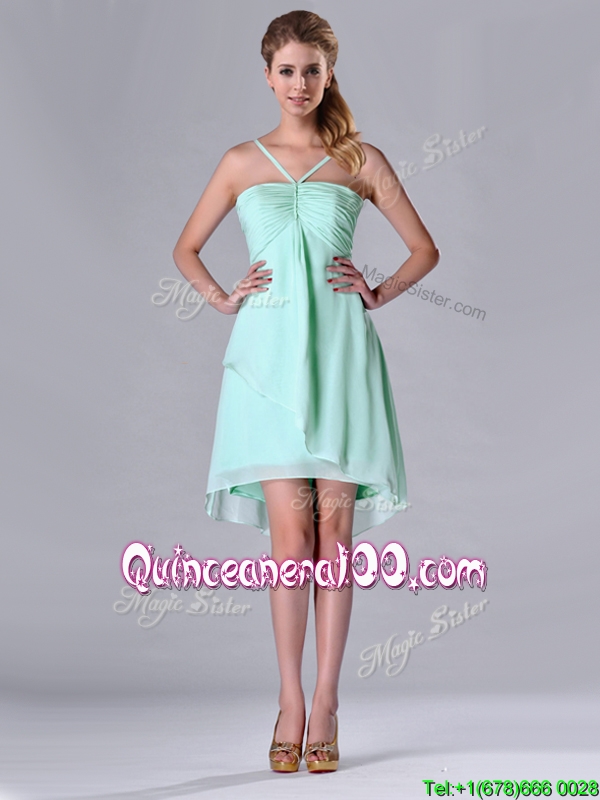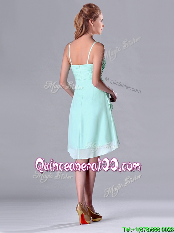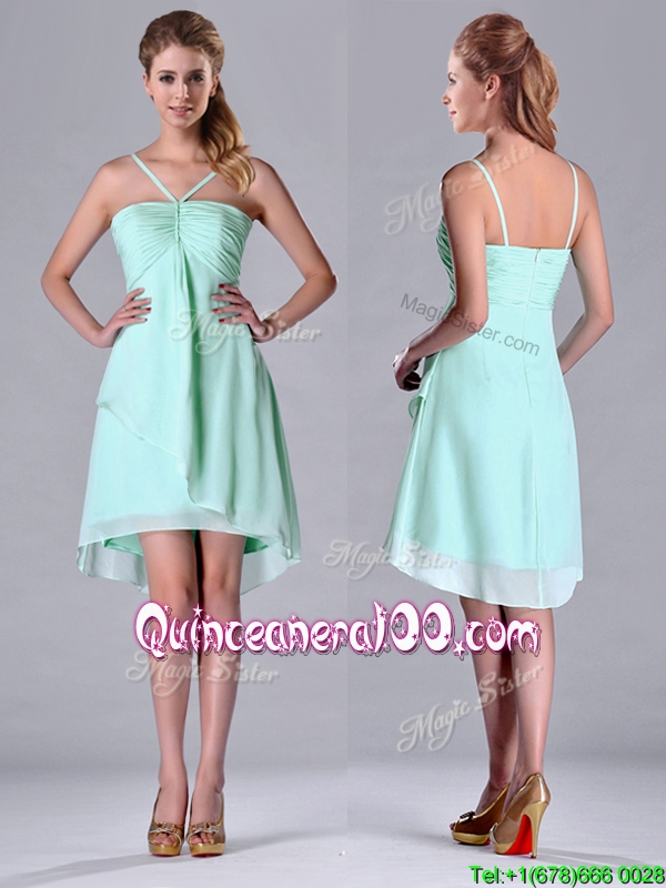 Neckline : StrapsShown Color : Apple GreenSilhouette : EmpireSleeve Length : sleevelessHemline : asymmetricalBack Detail : ZipperFabric : ChiffonEmbellishment : RuchingOccasion : Prom,PartySeason : Spring,Summer,Fall