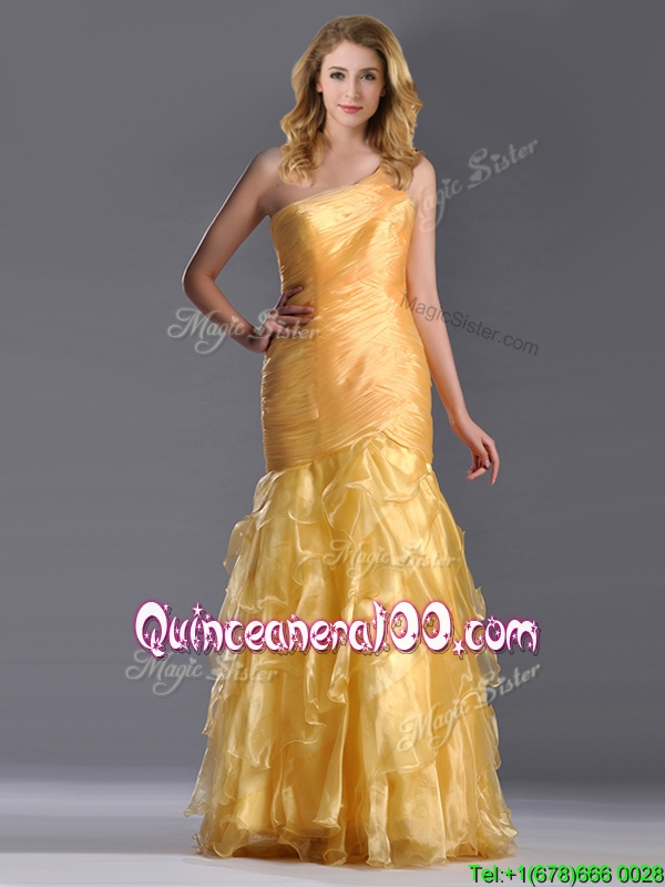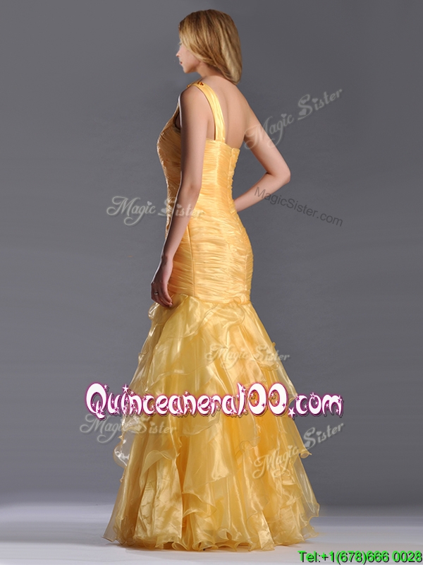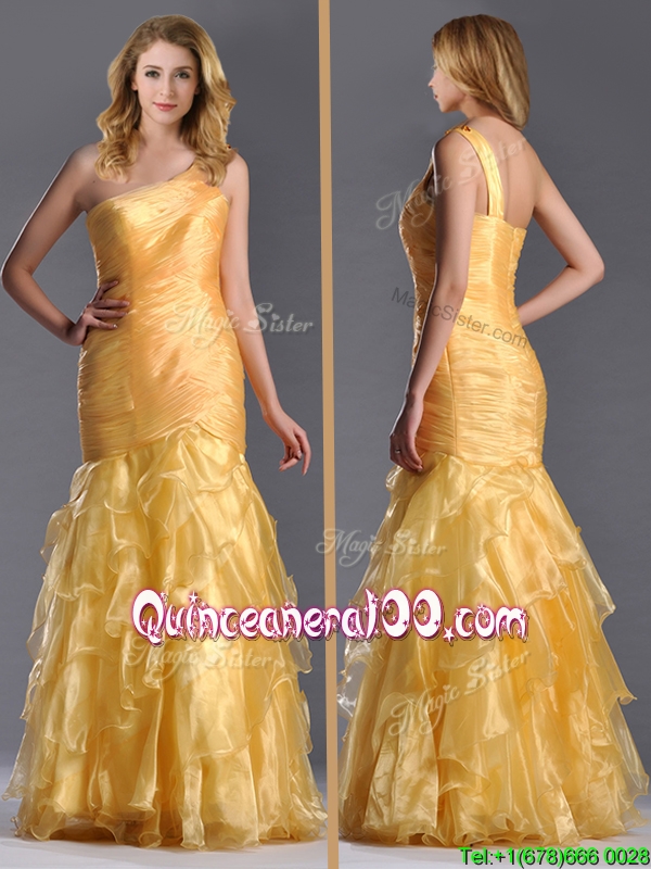 Neckline : One shoulderShown Color : GoldSilhouette : MermaidSleeve Length : sleevelessHemline : floor lengthBack Detail : ZipperFabric : OrganzaEmbellishment : RufflesOccasion : PromSeason : Spring,Summer,Fall,Winter