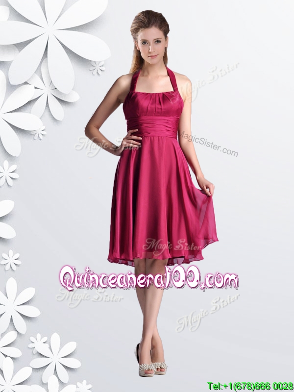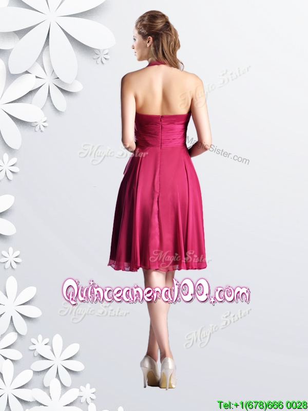 Neckline : Halter topShown Color : Coral RedSleeve Length : sleevelessHemline : knee lengthBack Detail : ZipperFabric : ChiffonEmbellishment : RuchingOccasion : Prom,PartySeason : Spring,Summer,Fall
