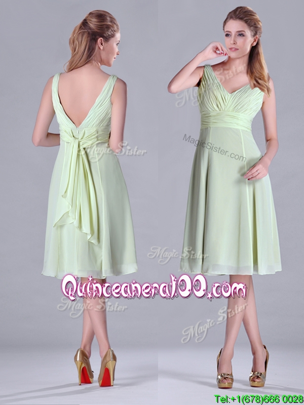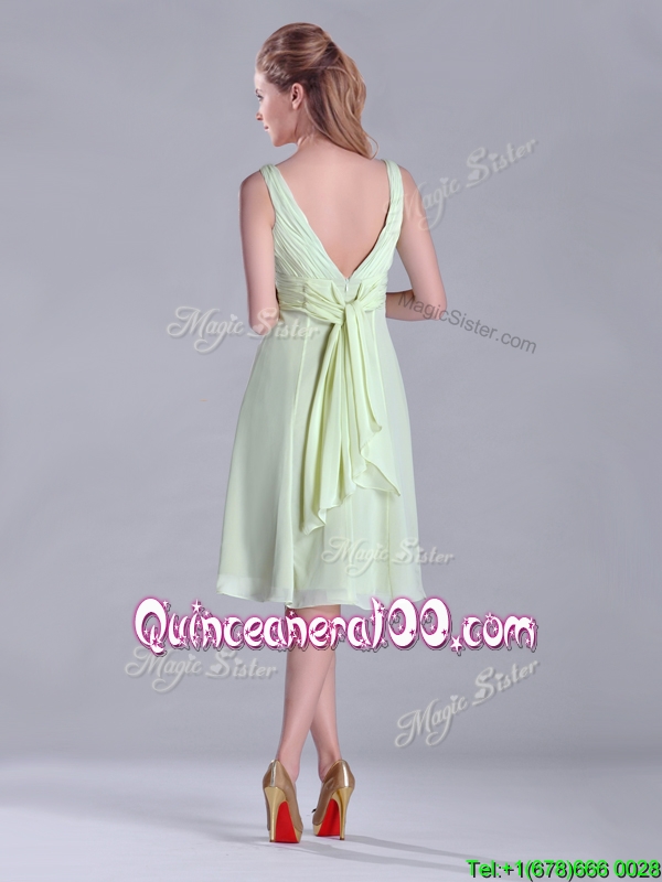 Neckline : V-neckShown Color : Yellow GreenSleeve Length : sleevelessHemline : tea lengthBack Detail : ZipperFabric : ChiffonEmbellishment : Ruching,BeltOccasion : PromSeason : Spring,Summer,Fall,Winter