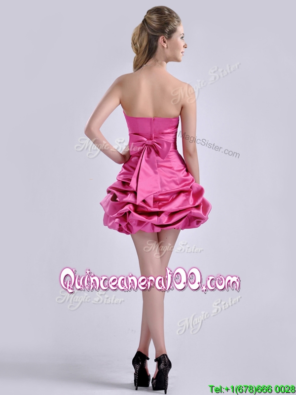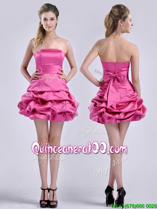 Neckline : StraplessShown Color : Hot PinkSilhouette : A-lineSleeve Length : sleevelessHemline : mini lengthBack Detail : ZipperFabric : TaffetaEmbellishment : Pick Ups,BowknotOccasion : Prom,PartySeason : Spring,Summer,Fall