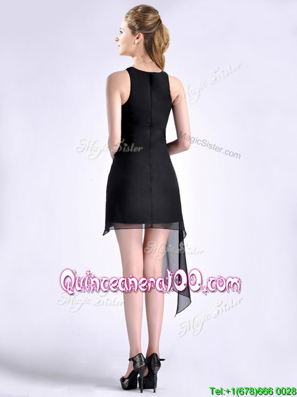 Neckline : ScoopShown Color : BlackSilhouette : EmpireSleeve Length : sleevelessHemline : asymmetricalBack Detail : ZipperFabric : ChiffonEmbellishment : BeadingOccasion : Prom,PartySeason : Spring,Summer,Fall