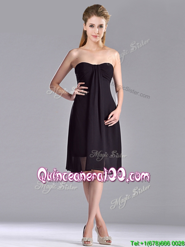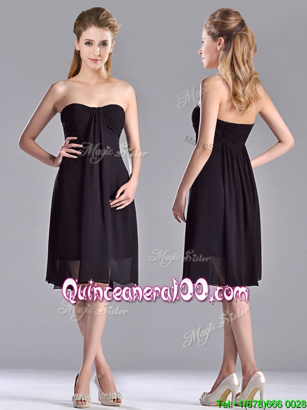Neckline : StraplessShown Color : BlackSleeve Length : sleevelessHemline : knee lengthBack Detail : ZipperFabric : ChiffonEmbellishment : RuchingOccasion : Prom,PartySeason : Spring,Summer,Fall