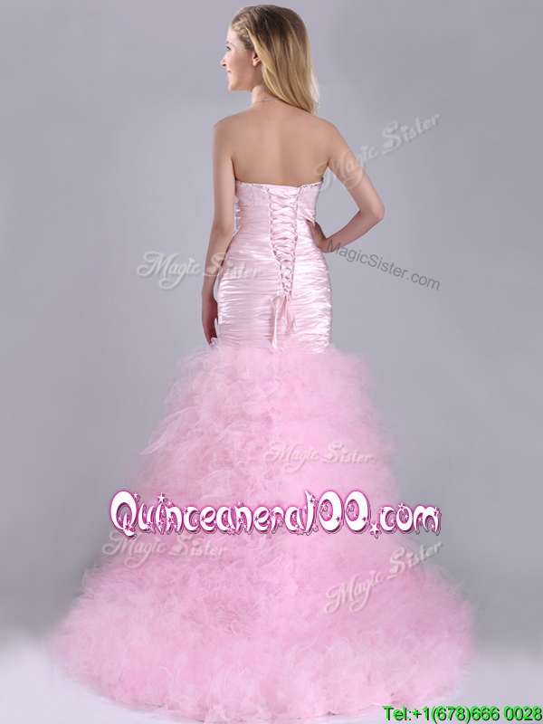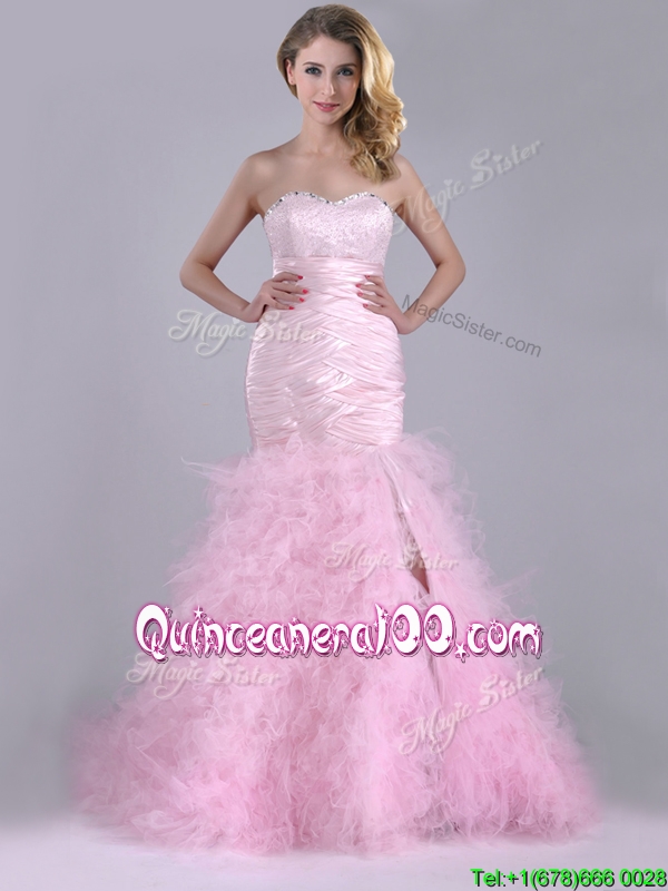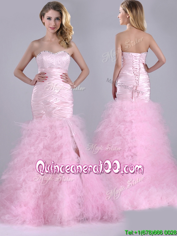 Neckline : SweetheartShown Color : Baby PinkSleeve Length : sleevelessHemline : floor lengthBack Detail : Lace upFabric : Taffeta,TulleEmbellishment : Beading,Sequins,RuchingOccasion : PromSeason : Spring,Summer,Fall,Winter